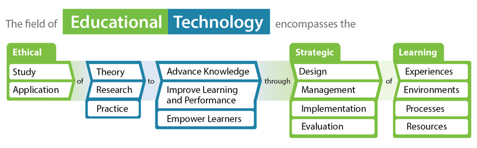 Bidang Teknologi Pendidikan mencakup studi dan penerapan etis dari teori, penelitian, dan praktik untuk memajukan pengetahuan, meningkatkan pembelajaran dan kinerja, serta memberdayakan pembelajar melalui desain, manajemen, implementasi, dan evaluasi strategis terhadap pengalaman belajar, lingkungan, proses, dan sumber daya.